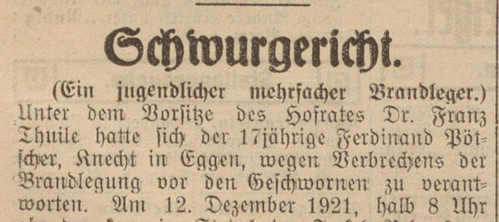Ein vom Gericht angefordertes ärztliches Gutachten attestierte Pötscher zwar eine Geistesschwäche, jedoch keinen „Schwachsinn“, weshalb er als zurechnungsfähig galt. Auch eine Pyromanie wurde ausgeschlossen. Am 13. Juni 1923 wurde Ferdinand Pötscher in Klagenfurt zu zwei Jahren schweren Kerkers verurteilt, wobei seine Geistesschwäche als mildernder Umstand gewertet wurde.