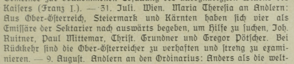 Grundsätzlich war es den Untertanen verboten, eine solche Reise zu unternehmen. Dass Gregor (zusammen mit anderen) in Regensburg war, blieb jedoch auch den Vertretern des Hofes nicht verborgen. Am 31. Juli 1752 schreibt die Herrscherin Maria Theresia an den Präsidenten der oberösterreichischen Repräsentation und Kammer, Franz Reinhold Graf von Andlern und Witten, und erwähnt Gregor Pötscher.