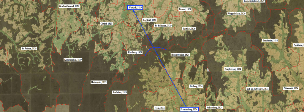 Das Innviertel gehörte bis zum Frieden von Teschen (1779) zum Herzogtum Bayern. Deshalb erfolgte der Grenzübertritt damals nicht – wie heute – am Inn, sondern bereits zwischen Frankenburg am Hausruck und Waldzell.