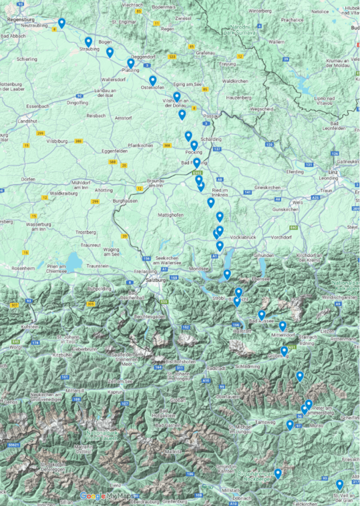 Zwein – Reichenau – Stadl an der Mur – Ranten – Schöder – St. Nikolai im Sölktal – Stein an der Enns – Mitterndorf – Bad Aussee – Lauffen – Bad Ischl – Weißenbach am Attersee – St. Georgen im Attergau – Mösendorf – Vöcklamarkt – Frankenburg am Hausruck – Grenzübertritt – Waldzell – Kirchheim im Innkreis – St. Georgen bei Obernberg – Obernberg am Inn – Tettenweis – Ortenburg – Hilgartsberg – Osterhofen – Plattling – Regensburg