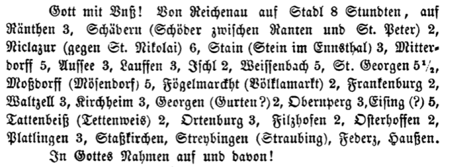 Die erwähnten Stundenangaben ergeben zusammen 82,5 Stunden. Ab Plattling (Plattlingen) sind keine weiteren Stundenangaben mehr ausgewiesen; man kann jedoch davon ausgehen, dass der Fußmarsch von Plattling nach Regensburg etwa 17 Stunden betrug.
